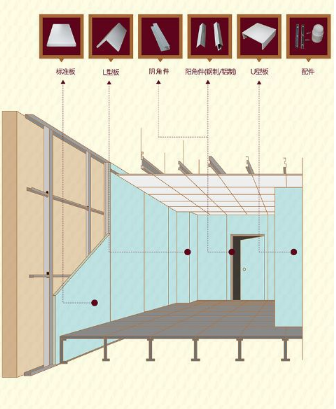 表面材料:鍍鋁鋅鋼板0.5/0.6/0.8MM,表面涂層:梅花白烤漆厚度≥25UM;靜電粉末涂層厚度≥45UM,鋼板背襯復(fù)合12MM法國圣戈班石膏板。
