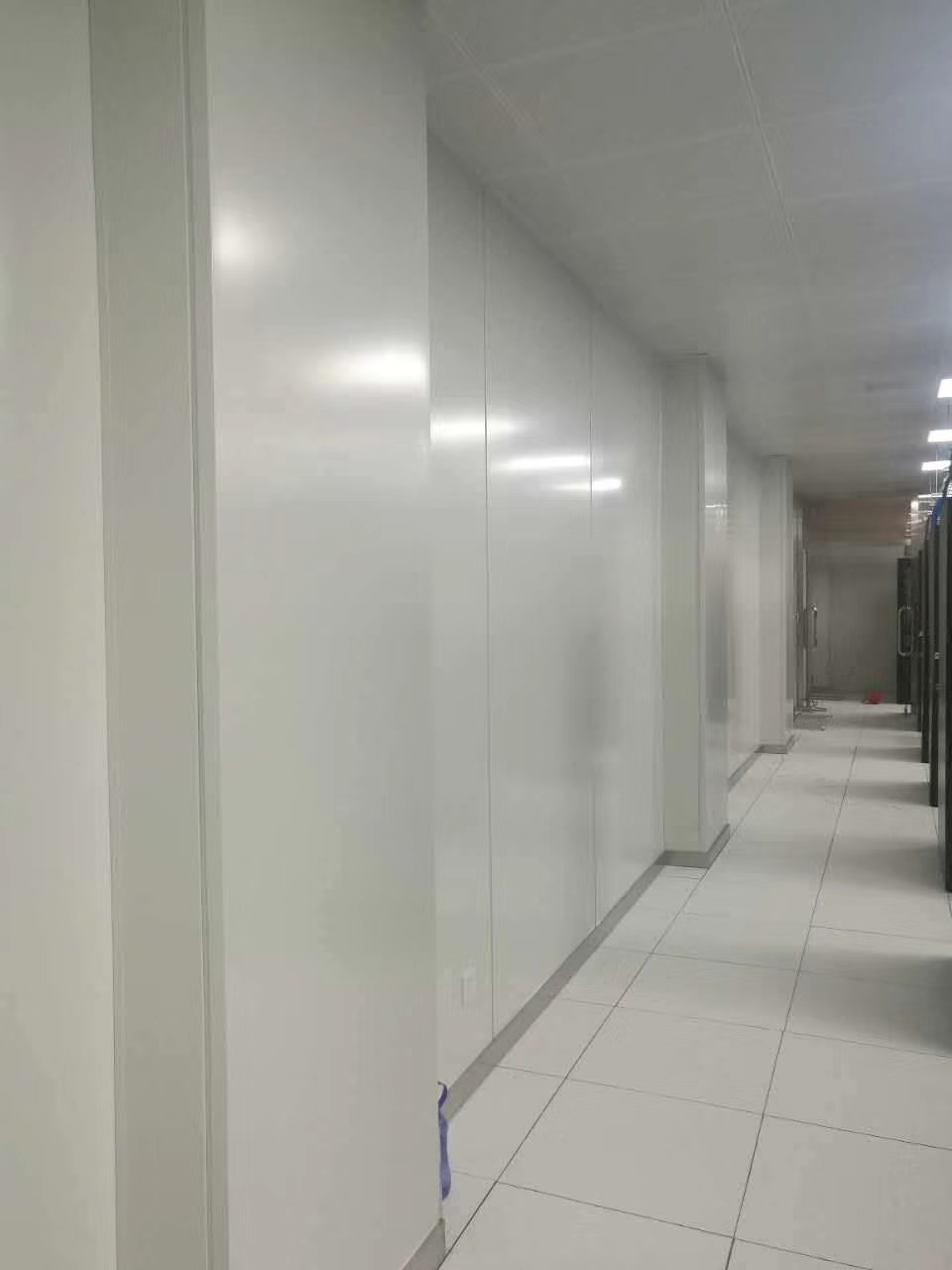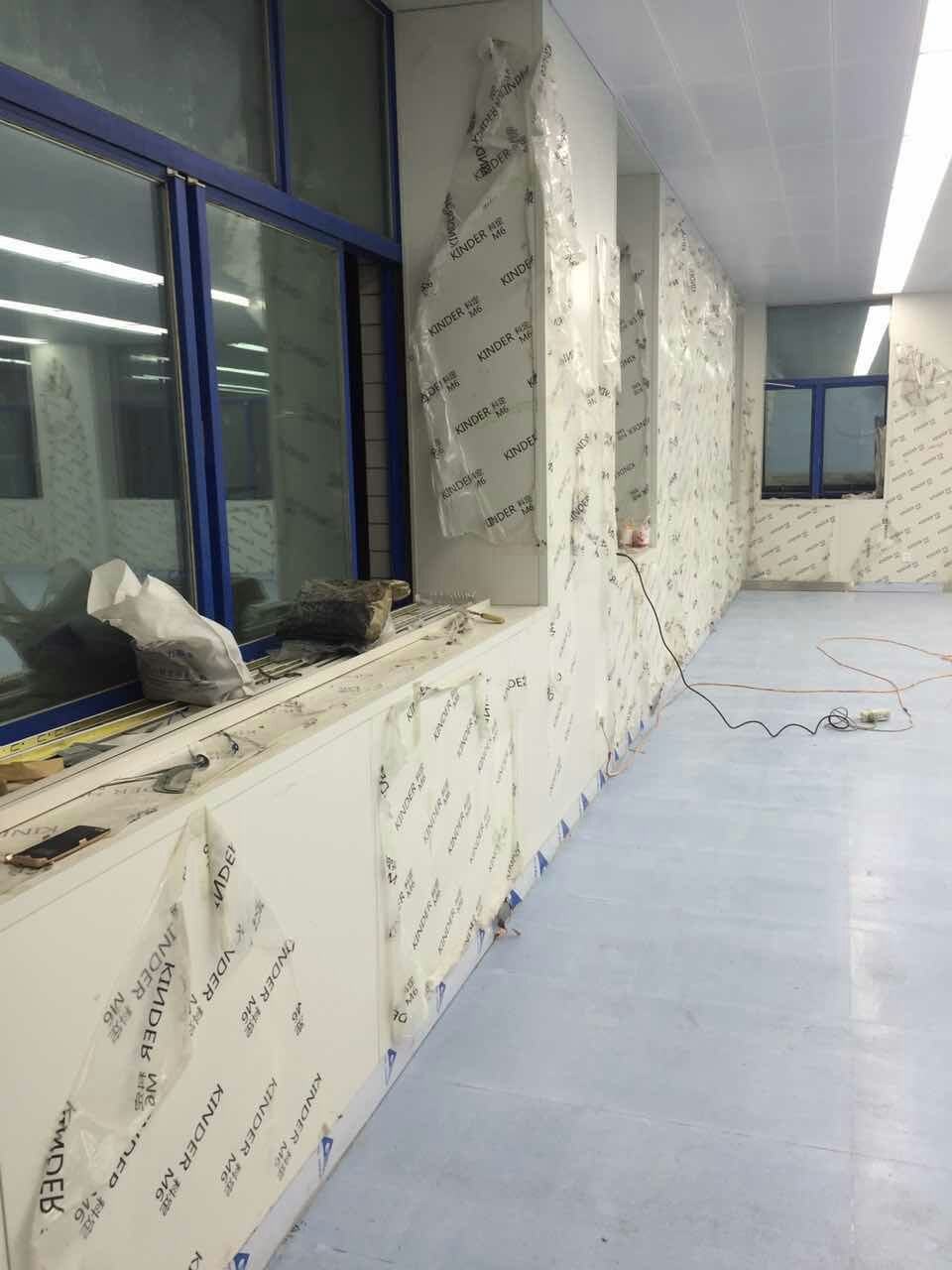2、由一側(cè)開始安裝彩鋼板,依次安裝,相連板間距12mm。隔板之間采用寬度12mm壓條,標(biāo)準(zhǔn)單元墻板均可互換。
