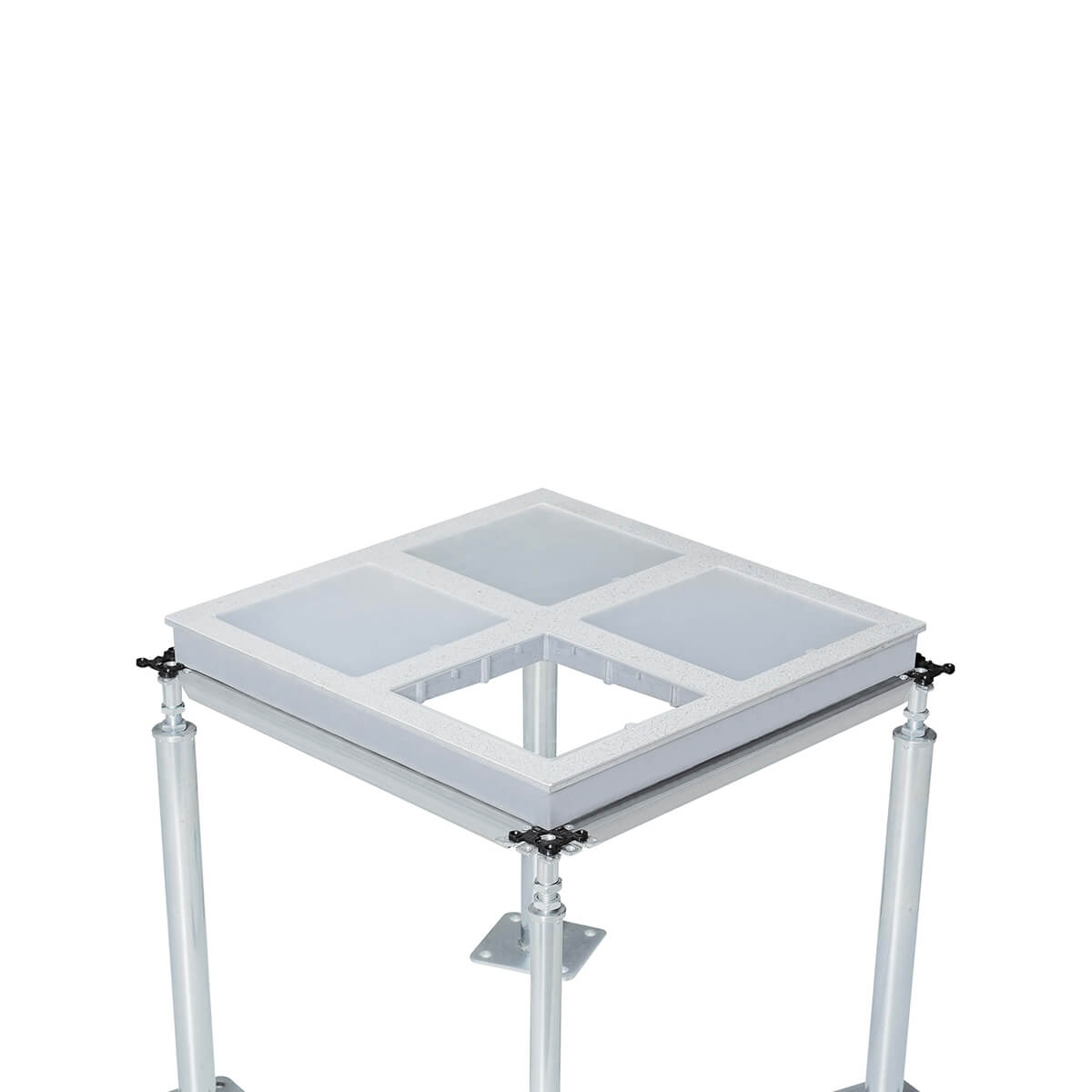 “科定”牌高壓鑄鋁合金窗口地板,表面通過銑床加工出四個窗形方孔,并覆蓋亞克力透明有機板,形成四個可視窗口。